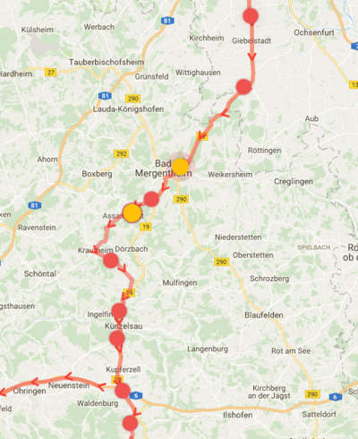 By clicking the button located at the right end of the daily view, the route made during the investigated period is displayed on the map, where the events detected on the basis of the selected green drive criteria are indicated by animated, pulsating indicators. The red indicators hide multiple events. Single events are marked with yellow indicators, and can be checked one by one by zooming in with a single click on the red indicator. The yellow indicators' size is proportional to the severity of the event, so a 30mph over-speeding means a larger indicator than a 10mph over-speeding.