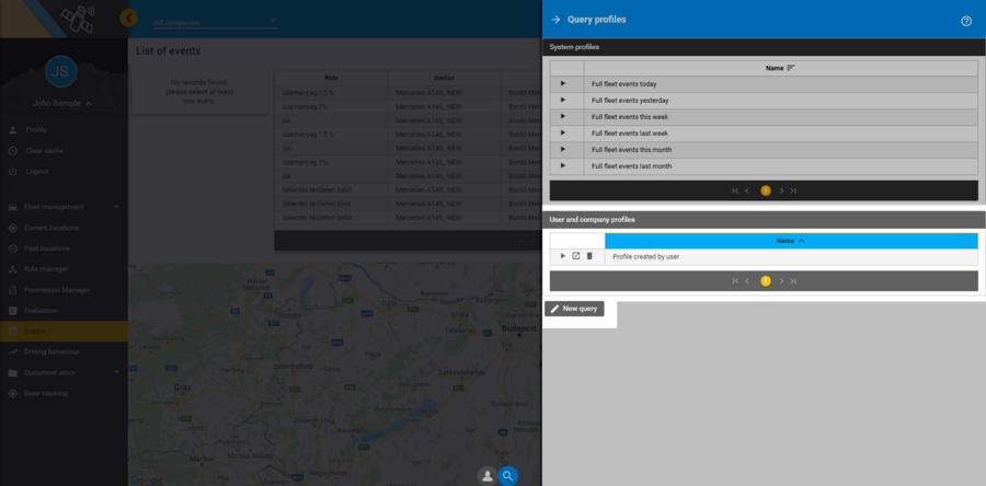 The New query button opens the Search panel, which slides in from the left. After setting the search criteria along the company's specific needs (timeframe, devices, vehicles, etc.), the query can be run by clicking on the Search button. Having run the query, it can be saved as User and company profile, with the initial system profile's, or a new name, accompanied by a short description.