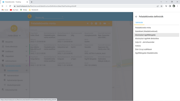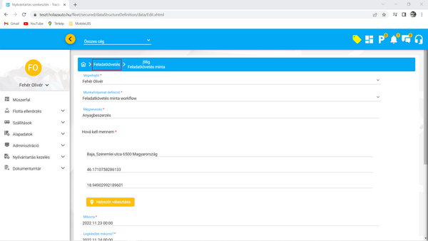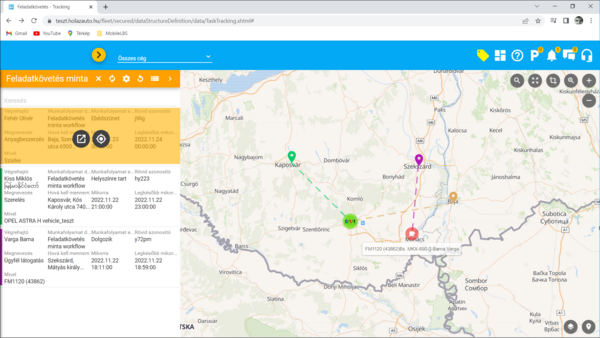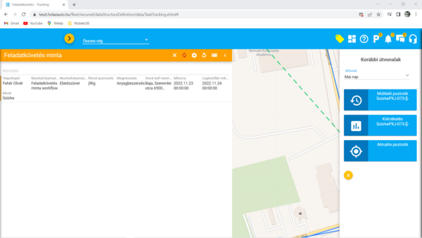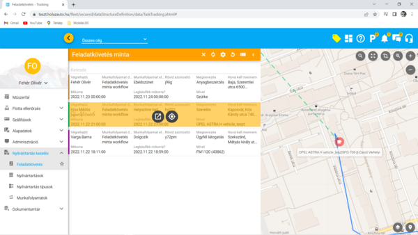Ebben a fejezetben a Feladatkövetés típusú, speciálisnak mondható nyilvántartás típusról írunk részletesen. A kapcsolódó (fent felsorolt) súgó fejezetekben az egyedileg kialakított nyilvántartások azon fajtáival ismerkedtünk meg, amelyek a képernyőn a hagyományos, szűrhető, sorrendezhető listákból kiinduló, adatlap formátumú felhasználást teszik lehetővé. Ezekben a nyilvántartásokban mint rendszerszintű alapadat, megjelennek olyan információk, amelyek a flottakövető rendszerhez kapcsolódó információkat jelenítenek meg. Gondoljunk csak olyan nyilvántartásokra, ahol például egy kiszállásos szerviz szolgáltatást végző cég szeretné az ügyfeleknek végzett karbantartási és hibaelhárítási munkáit nyilvántartani, nyomon követni. A kialakított nyilvántartásban megjelennek olyan adatok hogy a szolgáltatást igénybe vevő ügyfél, az ügyfél telephelyének címe, hogy az adott szolgáltatást melyik szerelő végzi, illetve hogy a kiszálláshoz a vállalkozás mely gépjárművét használja. Mennyire kézenfekvőnek tűnik, hogy az adott napra szervezett munkákat ne csak egy szűrhető listában próbáljuk értelmezni, hanem térképes felületen követhessük nyomon a mai napra tervezett javítások helyszíneit. A feladatkövetés tehát egy feladat típusú egyedi nyilvántartás és egy aktuális pozícó felület ötvözése, azaz a kettő hibrid nézete.