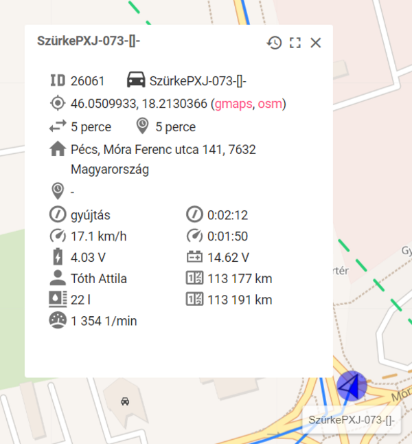 Amennyiben a térképes felületen a nyomkövetett objektumra (jármű) jobb egérgombbal kattintunk, egy helyi context menü jelenik meg. Ebben a menüben a Jármű adatlap kiválasztásával egy előreugró ablakban megjelennek a járművel kapcsolatos legfontosabb információk jelennek meg.