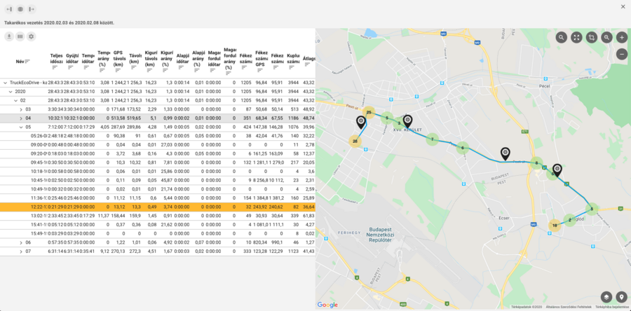 A táblázatban akár egy kiválasztott szakaszra, akár egy több szakaszt magába foglaló időszakra kattint a felhasználó, a térképen megjelenik az útvonal. Az útvonalon megjelennek a fékezéseket és kuplungolásokat jelző bóják, melyek a nagyítási szinttől függően klaszterbe rendeződnek. A klaszterre kattintva a térkép ráközelít és kibontja a bójákat.