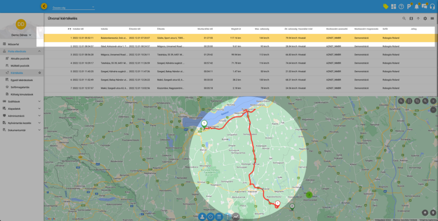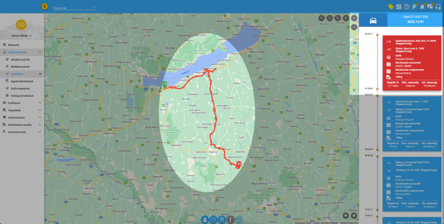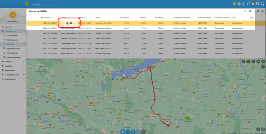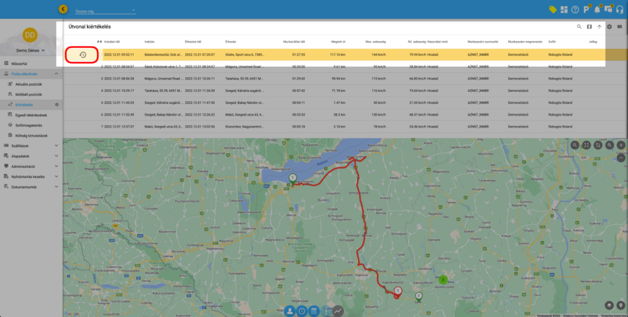 Az oldalsávban a kiválasztott szakaszra kattintva a térképen megjelenik az útvonal, az elejét és végét jelző ikonra kattintva pedig a térkép az adott lokációra közelít. Az oldalsávban a szakaszhoz tartozó információk találhatók, mint az indulási és érkezési cím és időpont, a szakasz hossza, valamint az átlag- és maximum sebesség. Ezzel a funkcióval a rendszer alapértelmezetten legfeljebb 5000 kilométernyi útvonalat jelenít meg, de ezt a tartományt egyéni vagy céges igény esetén bővíteni és szűkiteni is lehetséges.