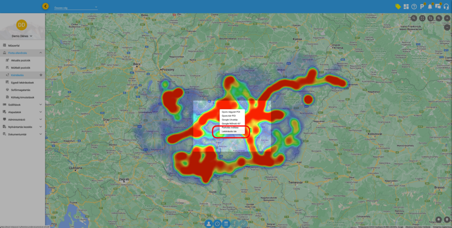 Ez a funkció nem egy kiválasztott útvonal vagy szakasz részletes vizsgálatára alkalmas, hanem nagyobb mennyiségű útvonal, magas megtett kilométerszám vizualizációjára. A hőtérkép segítségével egy pillantás alapján megállapítható hogy milyen útvonalakon közlekednek a rendszerbe tartozó járművek vagy eszközök a leggyakrabban, a térképes nézet távolításával pedig lehetőség nyílik a gyakran látogatott főutak, autópályák, vagy akár települések, országrészek áttekintésére is.