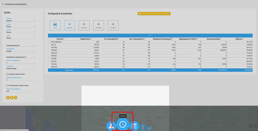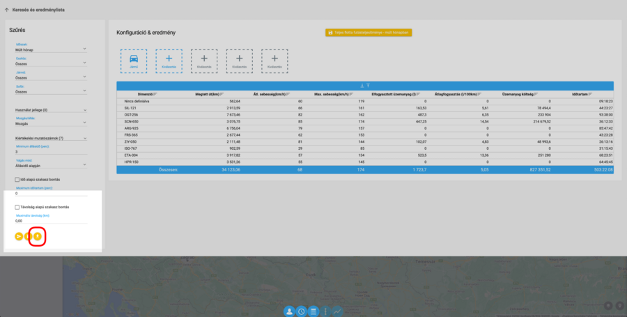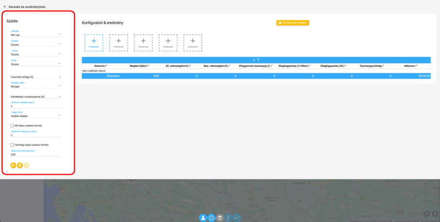 Az ablak bal oldalsávjában található a Szűrés, a rendszer az itt beállított paraméterek által meghatározott tartományból aggregálja az adatokat, az eredmény (azaz a riport) az ablak Konfiguráció és eredmény oldalán jelenik meg. A Szűrésben megadott paraméterek meghatározzák a lekérdezés idejének intervallumát, a figyelembe vett eszközök, járművek és sofőrök körét, a használati módot, a mozgás/állás vizsgálatát, a számításba vett szabálysértési eseményeket, és végül a kiértékelési mutatószámokat, melyek megjelenítése az eredmény táblázatban oszloponként ki- illetve bekapcsolható.