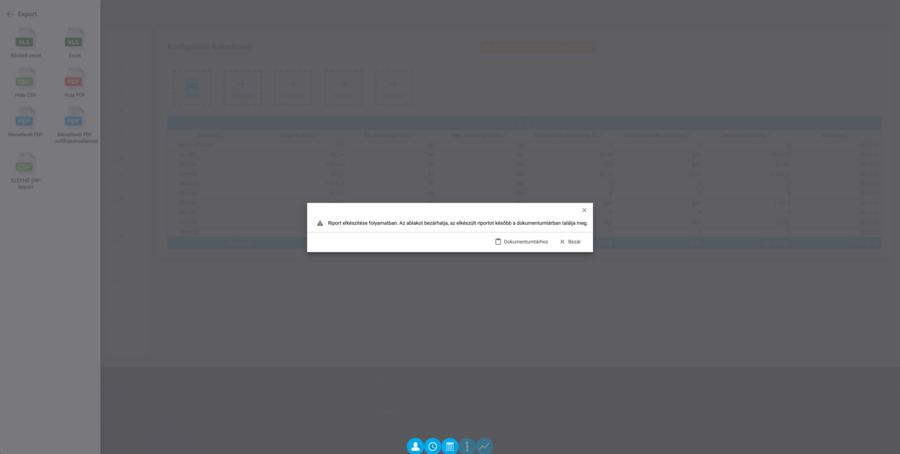 Az elkészült riportok nem kizárólag az alkalmazás felületein jeleníthetőek meg, a lekérdezések eredménye le is tölthető a felületről az Export gomb használatával, amely a Szűrő panel alján helyezkedik el. Az exportok a következő gyakran használt formátumokban állnak rendelkezésre:
