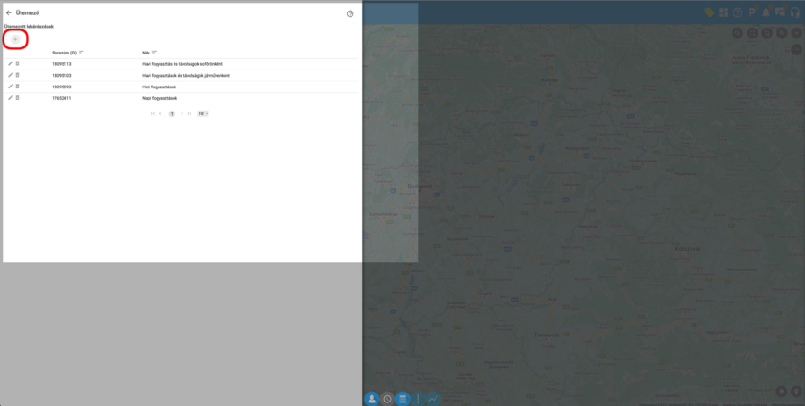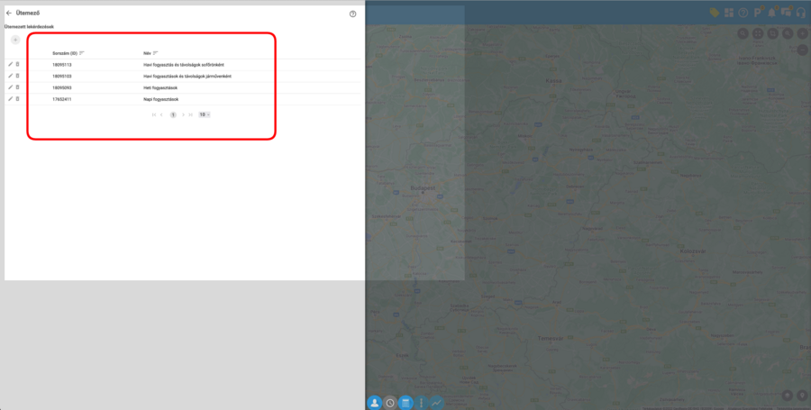 Az ütemező ablakban a létrehozott ütemezések listája található, az ütemezések bal szélén az ütemezés törlésére szolgáló szemetes ikon, jobbra mellette az ütemezés neve látható.