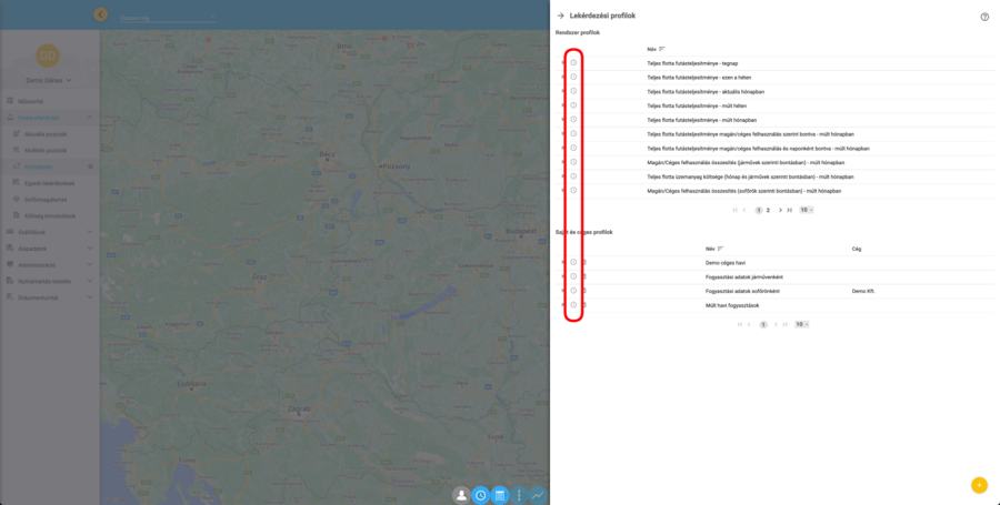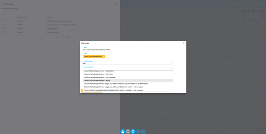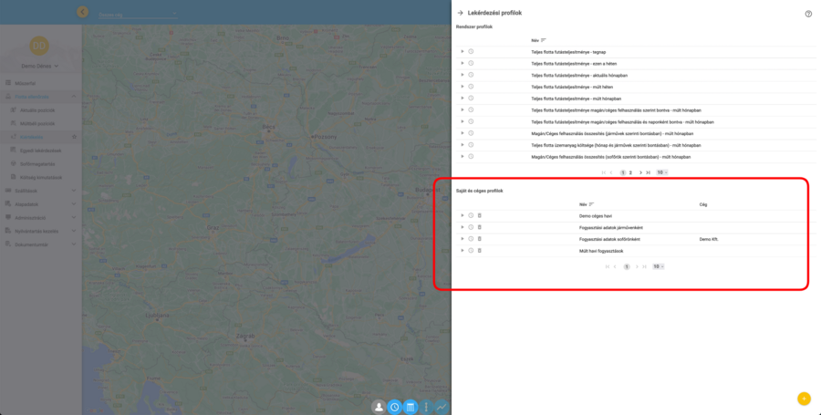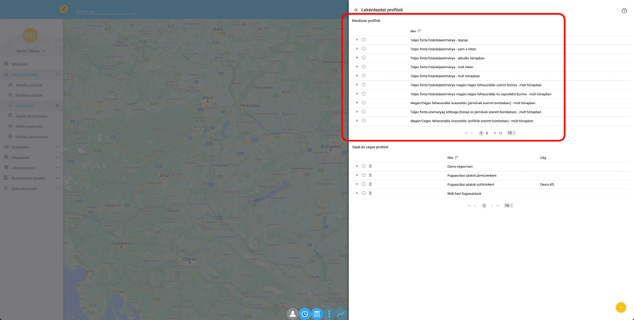Amennyiben a felhasználó nem állít be lekérdezési időintervallumot, alapértelmezetten minden esetben az adott napra érvényes a beállítás, eszköz, jármű és sofőr kiválasztásának hiányában a lekérdezésben a teljes tartomány szerepel. Amennyiben az új lekérdezést az eredmény kiértékelését követően egy későbbi időpontban, esetleg ismétlődően újra futtatni kívánja a felhasználó, elmentheti a Saját és céges profilok közé.