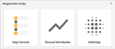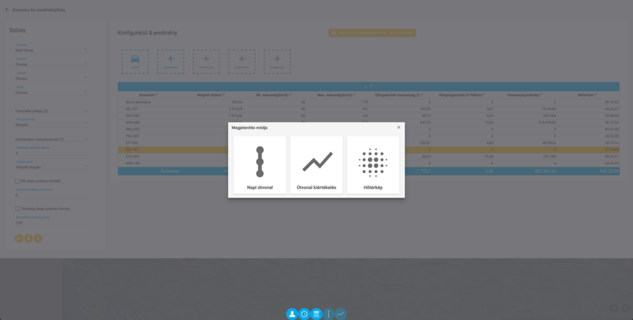 A lekérdezések eredménye a Konfiguráció és eredmény oldalon, táblázatban jelenik meg. A táblázatban vízszintesen a kiválasztott dimenziók szerinti bontás, oszloponként pedig a kiértékelési mutatószámok jelennek meg. A kiértékelés eredménye térképen is megjeleníthető. A táblázat egy sorára kattintva három féle térképes megjelenítési mód, a Napi útvonal, az Útvonal kiértékelés, és a Hőtérkép közül választhat a felhasználó.