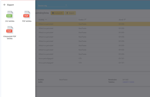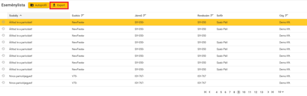 A keresési eredmények letöltésére is nyílik lehetőség, a lista felett elhelyezett Export gomb használatával. Mivel egy konkrét szabály által létrehozott események kiszűrésére is van mód, szabályonként exportálhatóak az események, de szűrhetők a szabályszegések dátum, eszköz, jármű, sofőr és cég alapján is.