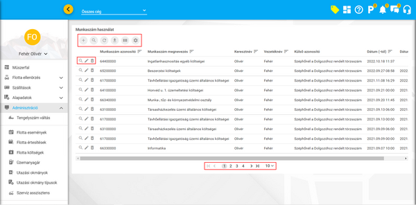 A lista dátum tól-ig, egy-egy konkrét munkaszám illetve partnercég, valamint személyekre és járművekre szűrhető, az oszlopfejlécekre kattintással sorrendezhető, a lista alatt lapozóelem található.