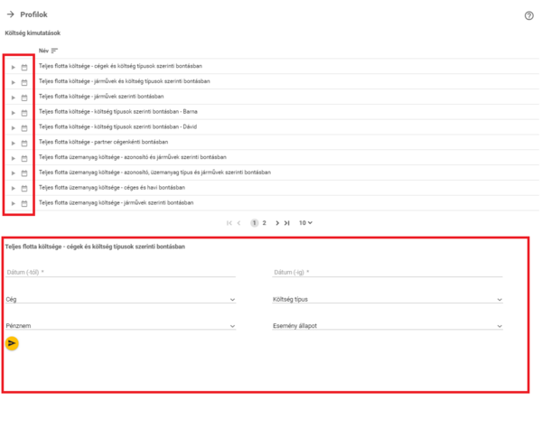 A Profil futtatása gombra kattintva a lista alatti területen megjelennek a kiválasztott profil paraméterei (dátum, jármű, cég, költség típus, stb.), melyeket a felhasználó ilyenkor még módosíthat.