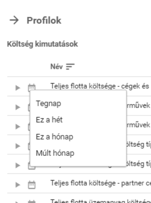 A vizsgált időszak dátuma bármely profil kiválasztása esetén változtatható, a gyakran használt intervallumokat a Dátum választó gombra kattintva megnyíló gyorsválasztóban éri el a felhasználó, de manuálisan is beírható a dátum.