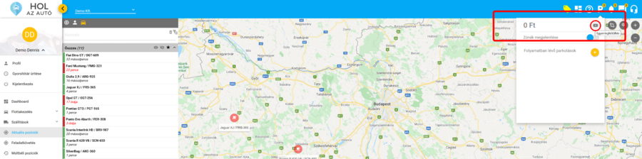 Minden parkolási bejegyzés bal szélén található egy nagyító ikonnal jelzett gomb. A gombra kattintva megnyílik a parkolás térképes nézete, amelyben a parkoló jármű helyzetét egy kék bója mutatja.