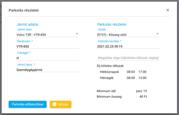 Ha egy adott parkolózónáról indul a parkolás, annyiban különbözik a már ismertetett folyamattól, hogy a Parkolás részletei ablakban a zónára vonatkozó adatok automatikusan kitöltődnek, és nem módosíthatók.