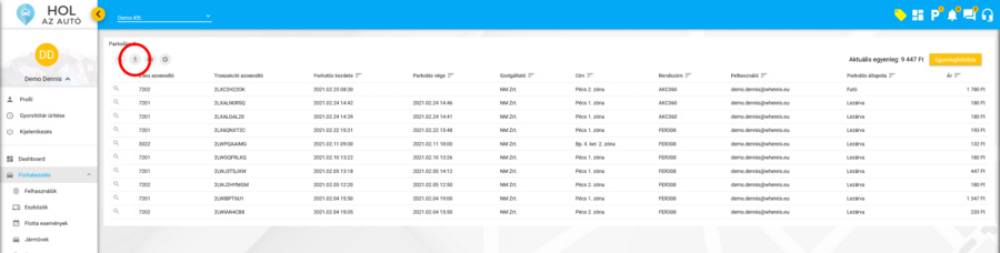 A Parkolás menü az online parkolás funkció adminisztratív kezelőfelülete. Itt található a parkolási lista, a szűrőpanel, az adatexport, és ahogy már említésre is került, látható a parkolási egyenleg, melyet a felhasználó egyúttal fel is tölthet.