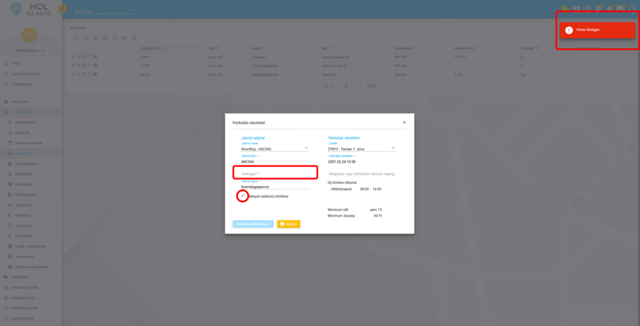 A bal oldalon, a jármű nevét kiválasztva a többi adat automatikusan kitöltődik. Az online parkolás funkció rendeltetésszerű működéséhez a következő adatokat a jármű adatlapon felhasználóinknak rögzíteni kell: