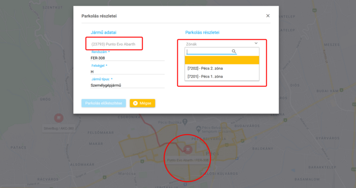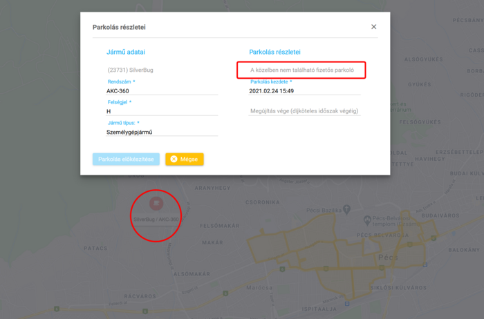 Abban az esetben ha nincs parkolózóna a jármű közelében, akkor a járműről nem lehet parkolást indítani.