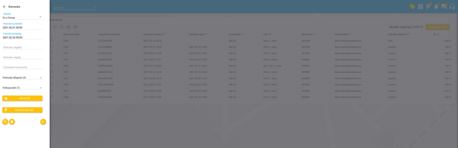 A keresési paraméterek segítségével könnyen és gyorsan szűrhető a parkolási lista tartalma. Ügyfeleink a következő paraméterek mentén kereshetnek a parkolások között: