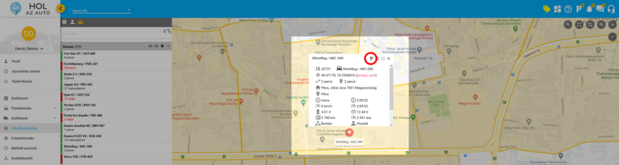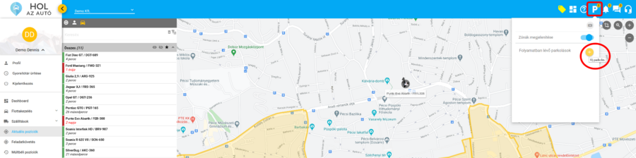 Egy adott jármű futó parkolása leállítható a jármű ikonról nyitható infóablakból is, az ablak fejlécében a P betűre kattintva.
