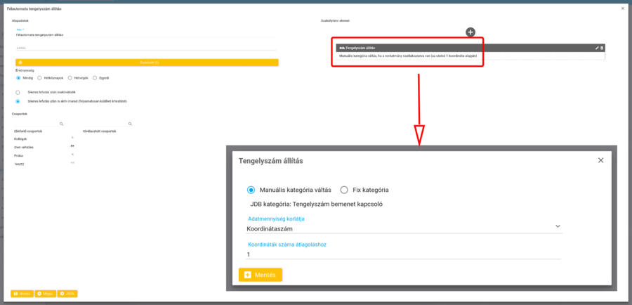 - A félautomata megoldáshoz a szabálykezelőben létrehozott automatizmusban a Tengelyszám állítás szabályelemet kell rögzíteni, a manuális kategória váltás opciót választva.