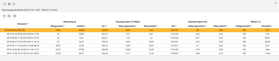 - A táblázat negyedik oszlopa pedig a fogyasztási normától való eltérést jelzi. Az összehasonlítás alapja, a norma értéke a jármű adatlapján állítható be.