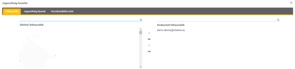 A felhasználókat - akik részére az azonos jogosultságokat akarjuk beállítani - a rendszer egyéb felületein már megszokott és jól használható két listás módszerrel lehet kiválasztani. A baloldali listában az elérhető felhasználók, a jobboldali listában a már kiválasztott felhasználók láthatók.