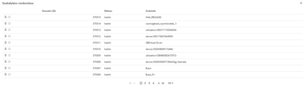 A megnyíló ablakban eszközönként aktiválható és deaktiválható a szabály(lánc), valamint a törlés gombbal az eszközök egyenként kivonhatóak a szabálylánc hatálya alól.
