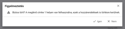 A törlés hatására a címke mind a címkék listájából, mind a hozzárendelt objektumok adatlapjáról törlődik, és ezután már keresési feltételként sem alkalmazható.
