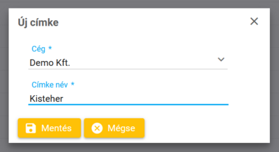 Létrehozáskor a címkét mindössze egy névvel kell ellátnod - amennyiben a létrehozó felhasználó több cégben is érintett, a céget is ki kell választani - és menthető az adatlap. Ha az objektum adatlapján hozod létre a címkét, mentéskor a címke automatikusan hozzárendelődik az adott eszközhöz, járműhöz, személyhez, illetve POI-hoz.