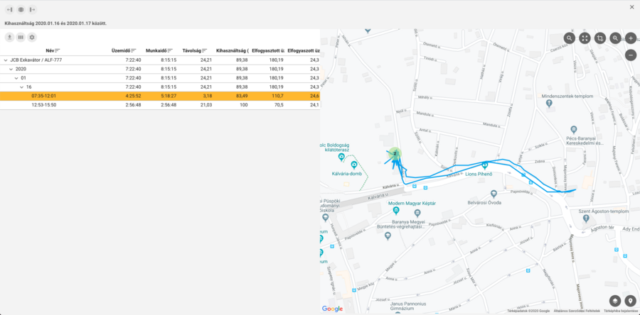 A lekérdezés eredményében a kihasználtság százalékos értéke mellett szerepel még a vizsgált időszak alatt megtett út hossza, a vizsgált intervallumra eső munkaidő és a tényleges munkavégzés időtartama is.