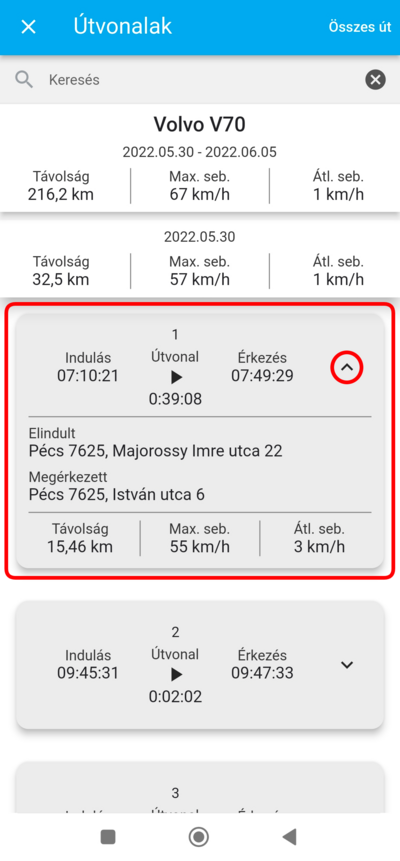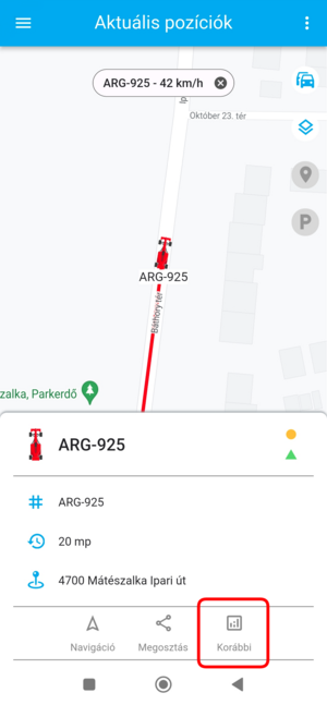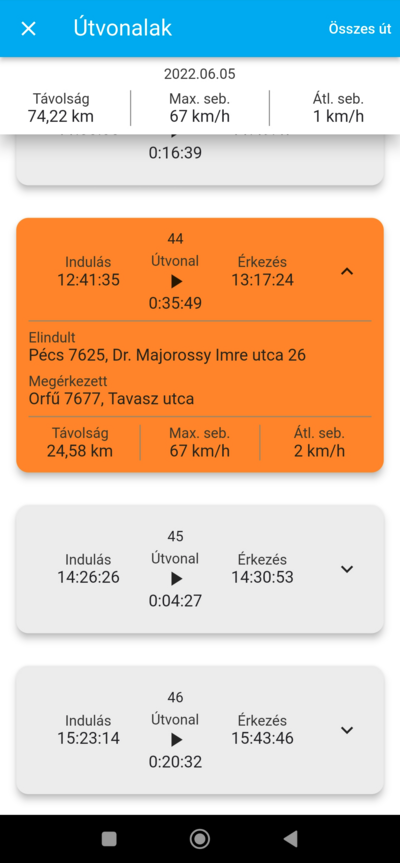 A lekérdezés eredménye, azaz a lekérdezett intervallum alatt megtett útvonalak a beállításoknak megfelelően szakaszokra bontva jelennek meg. A szakaszok kezdőpontját zöld, a végét piros bójával jelöljük.