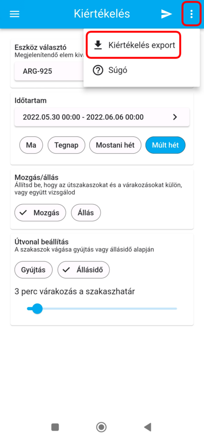 A lekérdezés eredményét nem csak a kijelzőn lehet megjeleníteni, hanem ezek exportjára is van lehetőséged. A paraméterek beállítását követően koppints a jobb felső sarokban, a lekérdezést indító gomb mellett elhelyezett három ponttal jelölt gombra, majd válaszd a Kiértékelés export opciót.