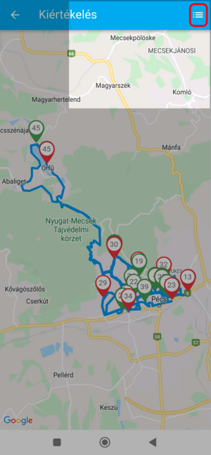 A térképen megjelenő szakaszok mindegyikéhez tartozik egy információs kártya. A szakaszkártyák listáját a képernyő jobb felső sarkában elhelyezett gombra nyomva nyithatod meg.